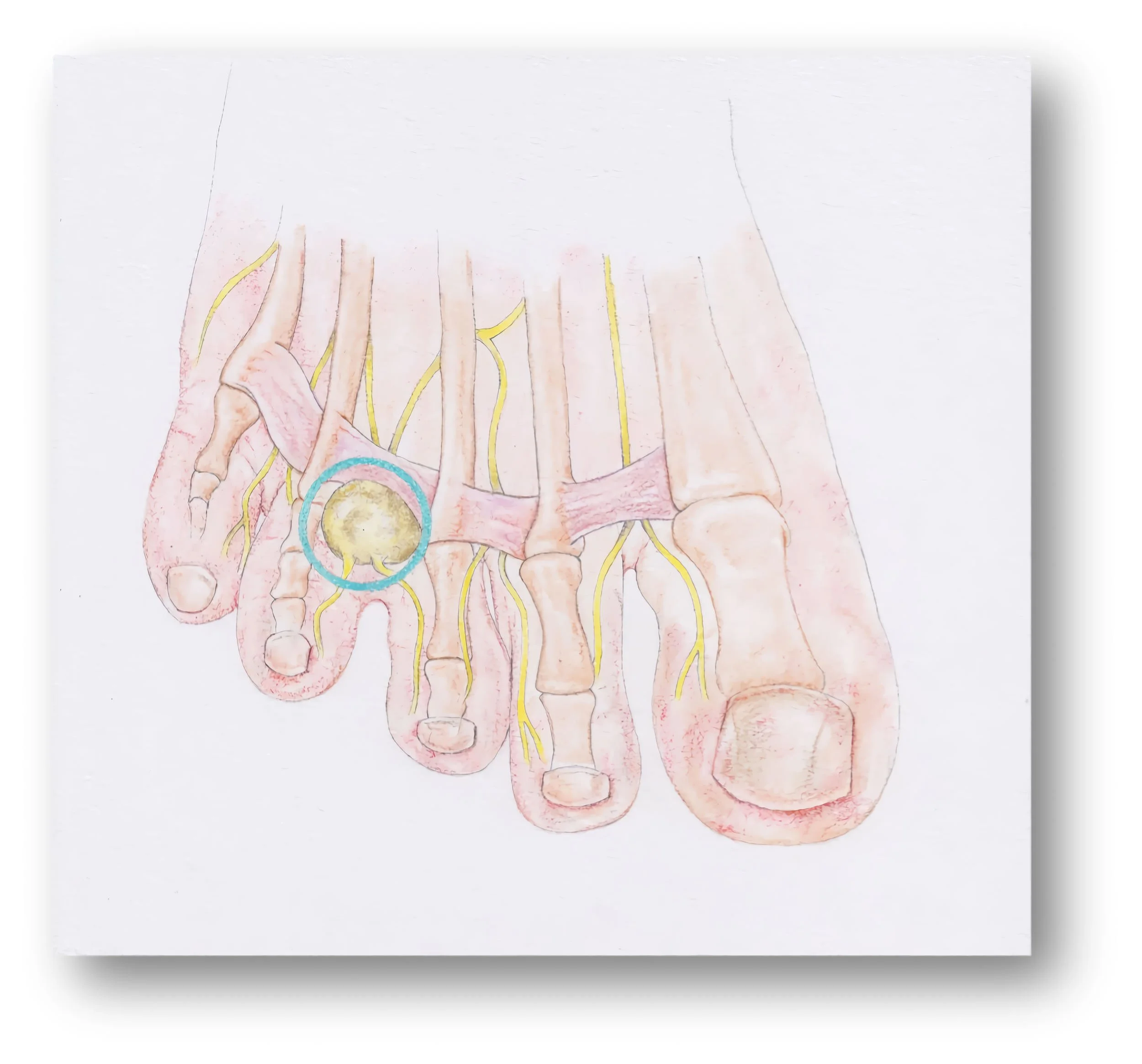 Dit is een goedaardige zwelling van een zenuw in de middenvoet, bekend als de tussentredezenuw, die tussen de middenvoetsbeenderen loopt. Dit kan verschillende ongemakken veroorzaken, waaronder pijn, tintelingen, gevoelloosheid en een brandend gevoel in het gebied. Meestal wordt de diagnose van een Morton's neuroom gesteld op basis van symptomen en een lichamelijk onderzoek of een echo. Soms kunnen aanvullende tests zoals een röntgenfoto of MRI-scan worden uitgevoerd om andere mogelijke oorzaken van de pijn uit te sluiten.
