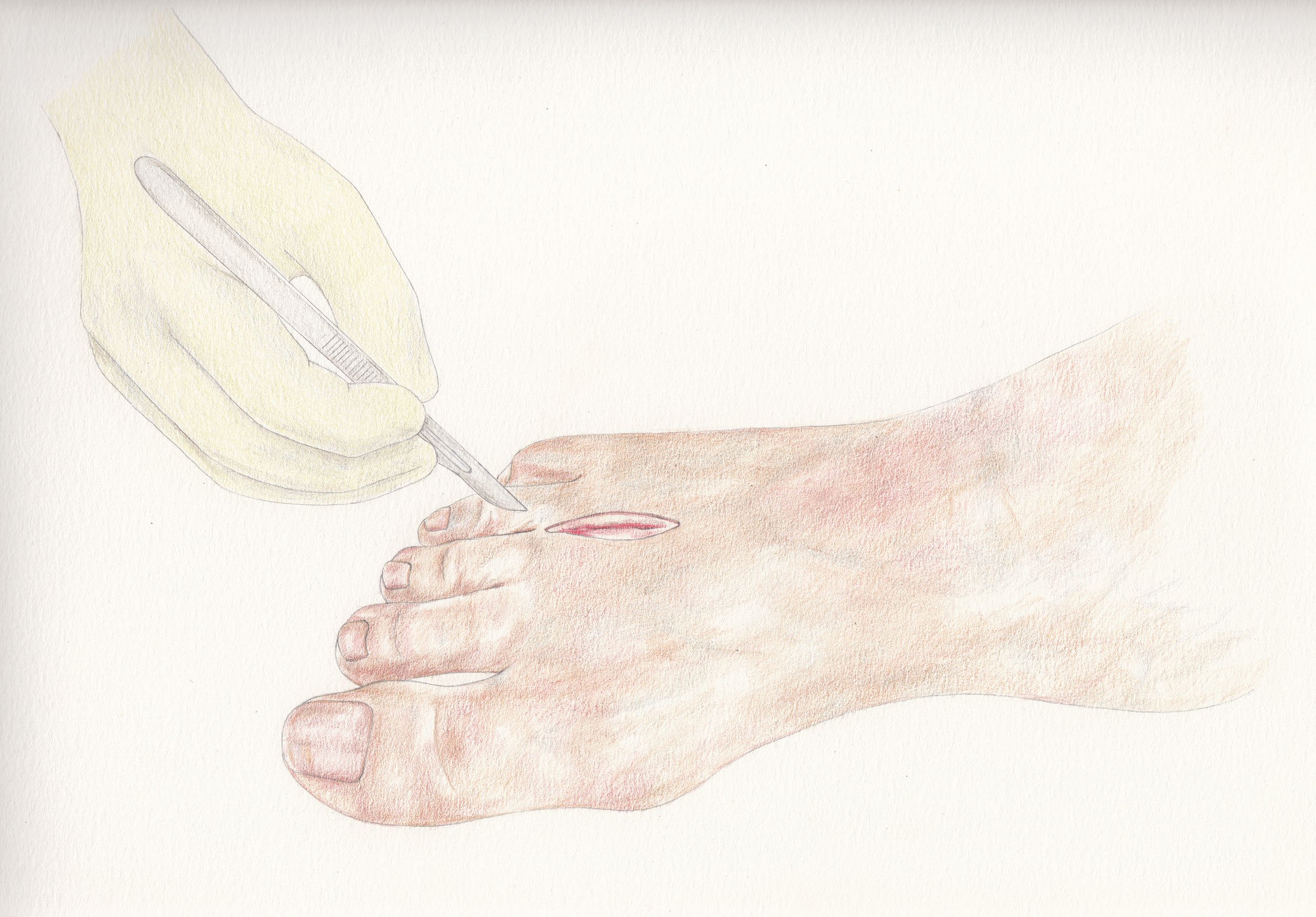 Wanneer de voet dik wordt, ontstaat er meer spanning op de wonden, waardoor de wond moeilijker geneest. Daarom is het verstandig het been regelmatig hoog te houden en eventueel ook af en toe met een ijscompress te koelen.